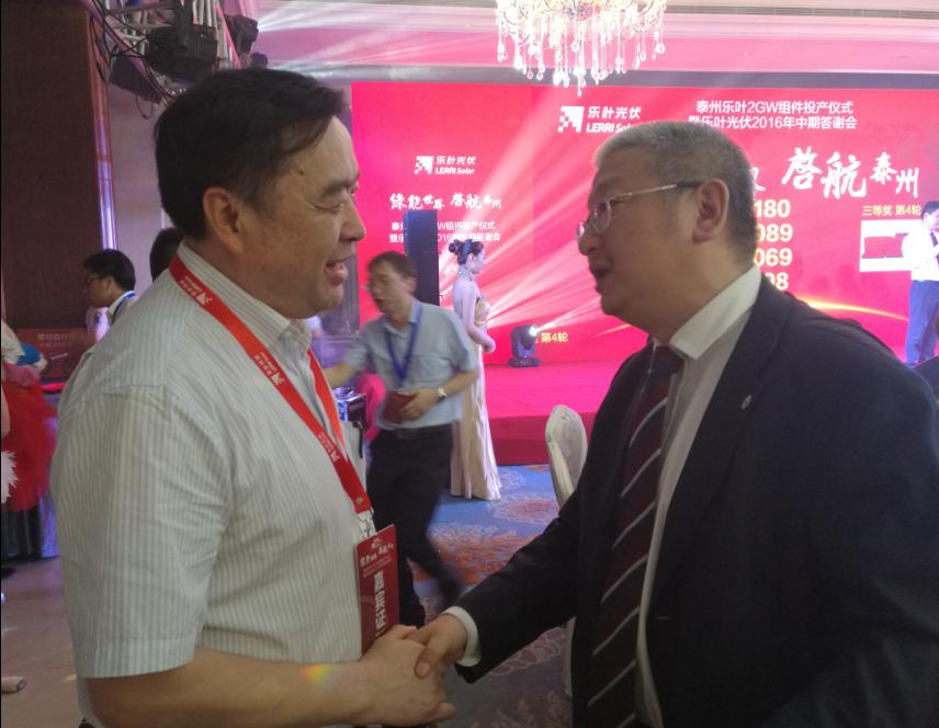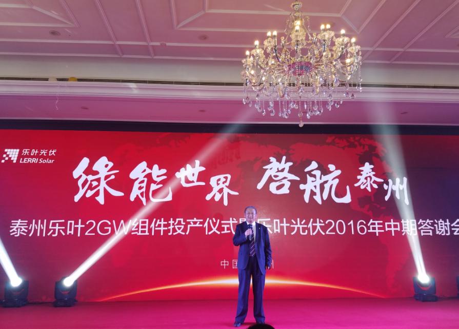 2016年9月6號,細雨綿綿,彩旗飄展,江蘇泰州市海陵區隆基樂葉2GW太陽能電池組件一體化項目舉行隆重的投產儀式。隆基股份董事長鐘寶申發表主旨演講。國務院參事、中國可再生能源學會理事長石定寰、國家發改委國際新能源研究所所長王進、招商新能源CEO李原、泰州市海陵區徐克儉書記等先后發表了熱情洋溢的講話。充分肯定了泰州樂葉建設的高速度、產能的高效化、盛贊隆基股份已成為國際單晶硅、硅片、電池、組件的最大供應商之一。